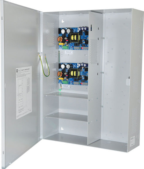 Maximal77FE Expandable Power System provides system designers and installers with optimum power choices and the highest levels of versatility. It provides 24VDC via two (2) single output power supply/chargers. System includes AC fail, low battery and battery presence monitoring. Enclosure facilitates up to four (4) 12VDC/12AH batteries. All interconnecting equipment must be UL Listed.