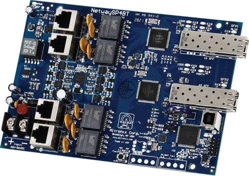 Altronix NetWaySP41BTB switch board supports up to 90W per port (320W total power) for deploying the latest high-powered IP devices in remote locations. It is equipped with two (2) 1Gb SFP ports to transmit data at long distances and four (4) 802.3bt compliant Ethernet ports. NetWaySP41BTB accommodates single/multi-mode fiber or composite cable (fiber+copper) to simultaneously deliver power and data from NetWay Spectrum head-end media converters/injectors.