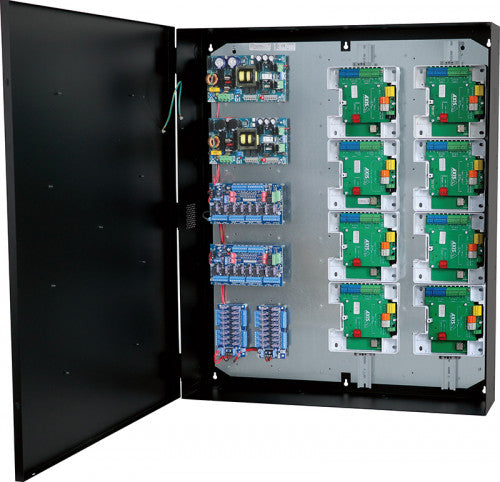 Altronix T3AXK77F16SV kit consists of Trove2 enclosure, TV3 Axis Communications/Altronix backplane with two (2) 24VDC @ 10A power supply/charger, two (2) eight (8) fuse protected dual input/output access control modules, two (2) 12VDC voltage regulators and two (2) sixteen (16) fuse protected dual input/output power distribution modules. This kit also accommodates up to eight (8) A1601 or A1610 or sixteen (16) A1210 modules for up to sixteen (16) doors in a single enclosure. Trove simplifies board layout and wire management, reduces installation time and labor costs.