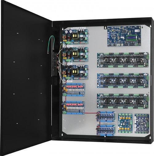 Altronix T3SK77724SDV kit consists of Trove3 enclosure and TSH3 Software House/Altronix backplane with three (3) 24VDC @ 10A power supply/chargers, two (2) twelve (12) PTC protected dual output access control modules, two (2) 12VDC 6A voltage regulators and two (2) sixteen (16) PTC protected dual output power distribution modules. This kit also accommodates various combinations of Software House boards for up to twenty-four (24)