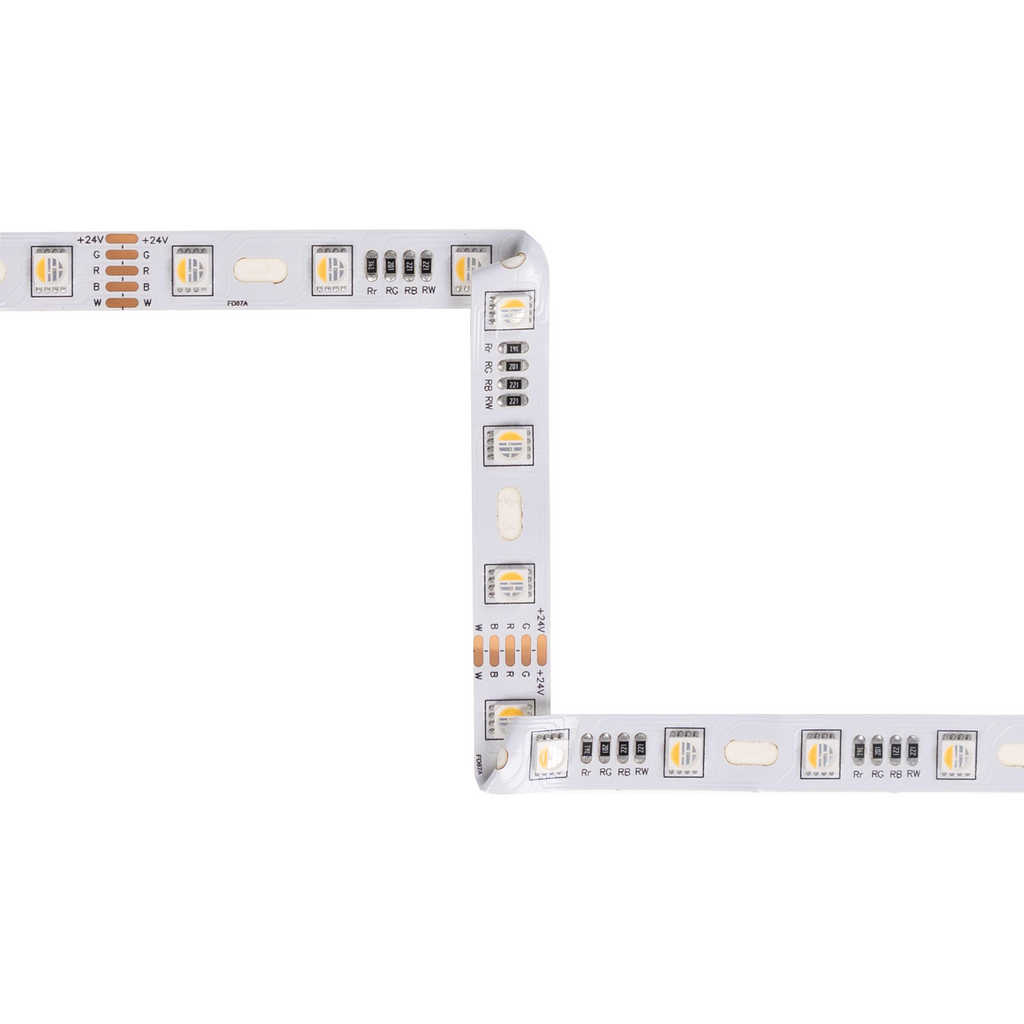 RGBW tape light with multi-axis flexibility, designed for intricate signs, lettering, light boxes, stage lining, and architectural accents. Eliminates the need for additional cutting and soldering when making 45-degree turns.