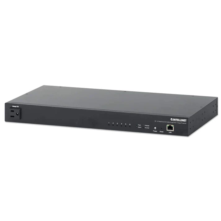 The 19" 1U Rackmount 6-Outlet Smart PDU / Surge Protector from Intellinet Network Solutions safely distributes and monitors power to the equipment in your network rack, server room or data center. It features six metered US NEMA 5-15R outlets with remote access and control, complimented by one non-metered bypass outlet. Access and manage the PDU via a web browser using the RJ45 Ethernet port on the front panel, while monitoring the delivered power in voltage and current. It can be installed horizontally in a standard 19" rack with the included rackmount brackets, or placed on its rubber feet for non-slip desktop use.
