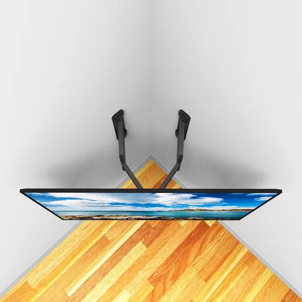 The Kanto PDC650 corner TV wall mount is specifically designed for inner and outer corner installations. Its two independent wall plates can be mounted to adjacent walls, allowing TVs up to 125 pounds to be safely positioned within a corner. Alternatively, turning the wall plates inwards allows for mounting to an outer edge, column or pillar. Depending on screen size and the distance between the wall plates, the articulating arms offer up to 40° of swivel in either direction. Further improve line-of-sight and reduce glare by tilting your TV 15° forward or 3° backward. The PDC650 Kanto corner TV mount also includes cable management clips and wall plate covers to ensure a professional looking setup.