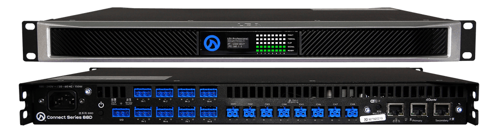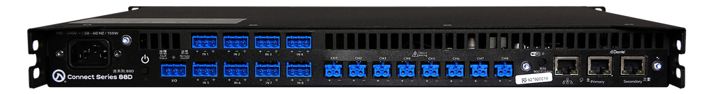 The CONNECTSERIES 88D is an 8-channel amplifier with 80 watts per channel. As part of the Dante CONNECTSERIES, the world’s first Internet of Things- (IoT) enabled professional-grade amplifiers, it is perfectly suited for small to medium-scale installations. The 88D features direct HiZ (70V or 100V) or LoZ selectable by channel. With three ways to connect, you can engage the built-in Wi-Fi access point, connect to the venue’s Wi-Fi, or use the FAST Ethernet to connect to any local area network via Cat5 or Cat6 cable.