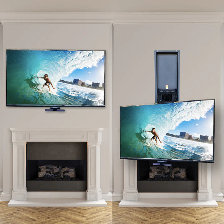 The award-winning MantelMount presents the new MM750, the second iteration in its Pro Series Manual Pull Down TV Mount line. This mount was deigned to handle larger, heavier TV's through a combination of higher grade steel, the use of four top echelon gas pistons instead of two, enhanced torsion rigidity, and a tubular tapered lifting arm. That MM750 provides an even smoother full range motion than its MM700 predecessor, increased off-the-wall and vertical travel distances, enhanced leveling for post-install leveling adjustments AND "Stop Anywhere Positioning" along the downward path of travel. The MM750 also comes standard with a solid steel housing that conceals the lifting arm when in the raised position. The housing can be surface mounted or recessed for 1.8 inch flush-to-wall TV storage. This Pro model is for home theater connoisseurs who only want the finest in everything.
