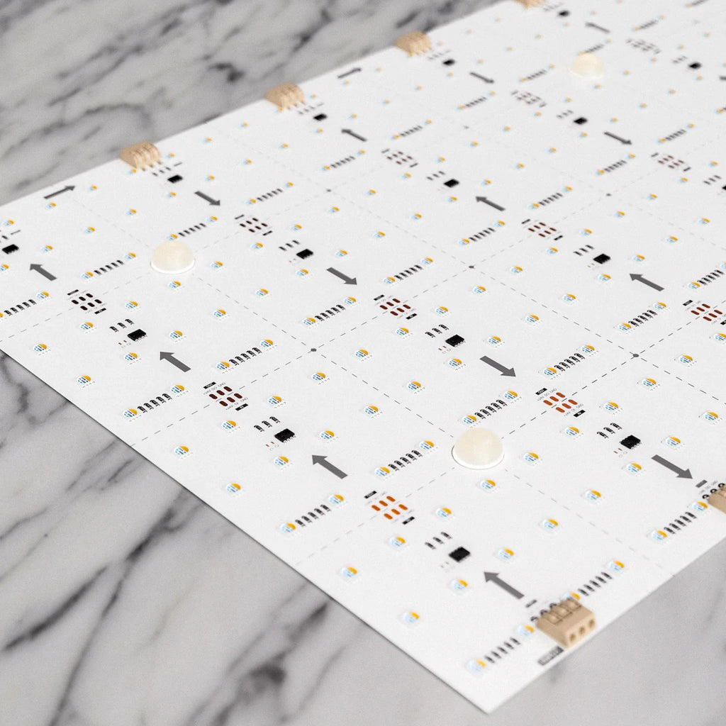 The Canvas Light Sheet is the ideal product for backlighting semi-transparent countertops and architectural features. The Digital Pixel RGBW version creates even more lighting options with pixel addressable LEDs. Cut the 12” x 24” sheet to size at the job site to achieve a perfect fit for your application. Built-in spacers help lift your material a half-inch off the light sheet for a leveled and diffused effect. 4-in-1 Digital Pixel RGB + 3000K Warm White Ideal for backlighting semi-translucent materials Up to 3100Lm output performance per sheet Available in 12”H x 24”W sheet size Field cuttable on-site for an accurate fit 3” x 3” Cuttability 3M peel and stick backing for quick installation Built-in terminal ports make it easy to run power from any side Integrated 1/2” stand-offs spaced every 6 inches: Each Stand-off is rated up to 35lb load rating (220lbs per sheet)