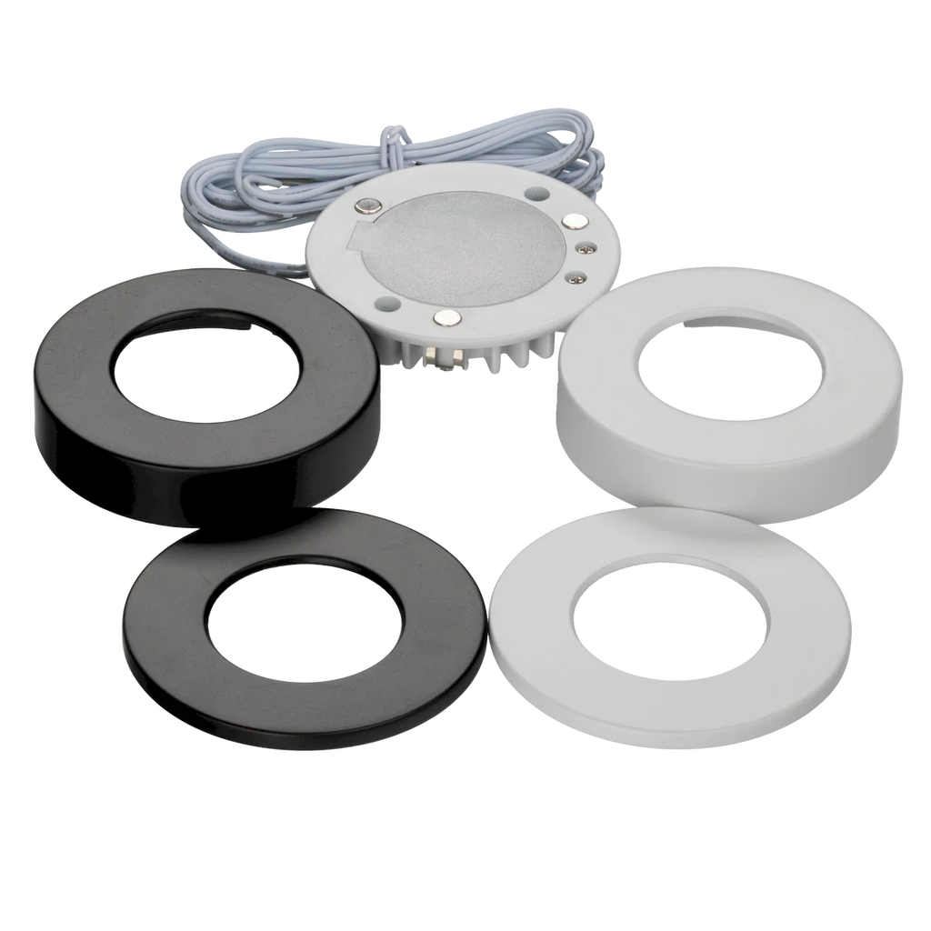 Proluxe PLX-OMNSLI-3CCT-WHBK 24V SUPER SLIM PUCK LIGHT, ROUND, FLEXIBLE MAGNET SCREWLESS TRIM CAN. SURFACE OR RECESS MOUNT, ALUMINIUM HOUSING 24V, 4W, CRI>90; 250-290L, DRY LOCATION, 5/8" HEIGHT; 72" LEADS. 2 ROUND TRIM RECESSED IN BK & WH