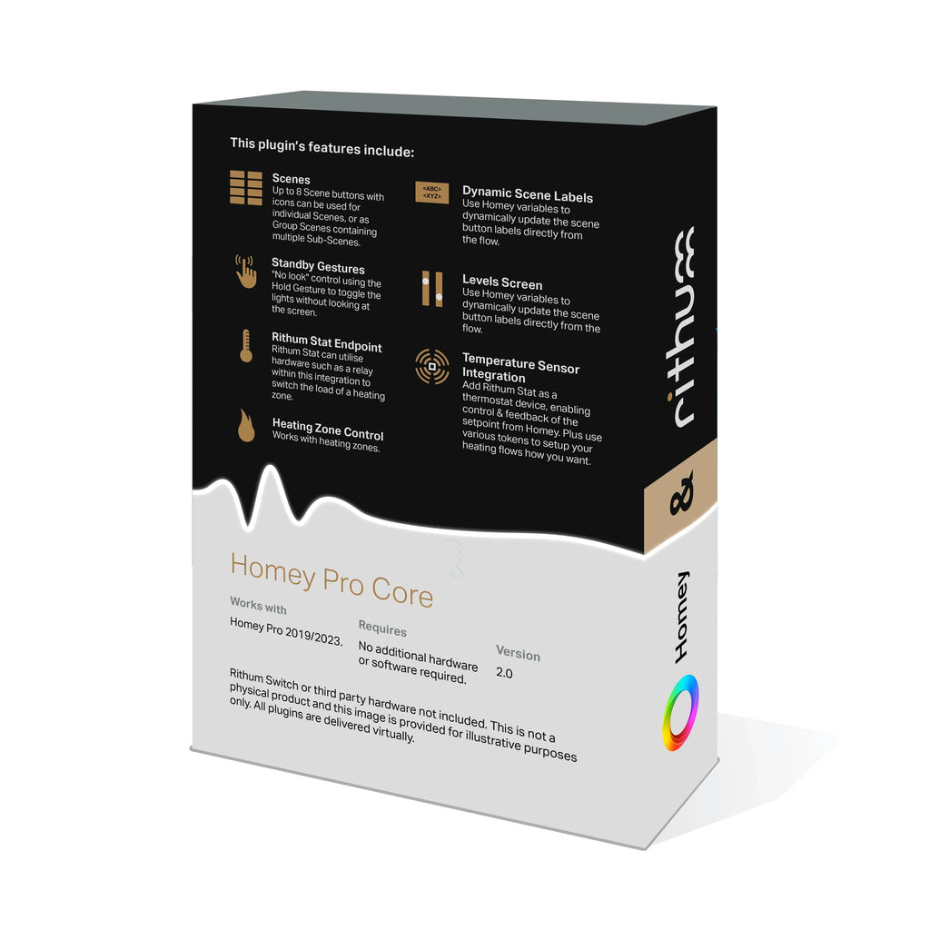 Rithum Switch now integrates with Homey Pro systems. This is a Core plugin which includes the core integration functionality and support for the Scenes Screen to trigger Homey Flows, and the Levels Screen for lighting brightness control. Plus it now integrates Rithum Stat in Homey. Additional screens may be supported in the future through Plus plugins.