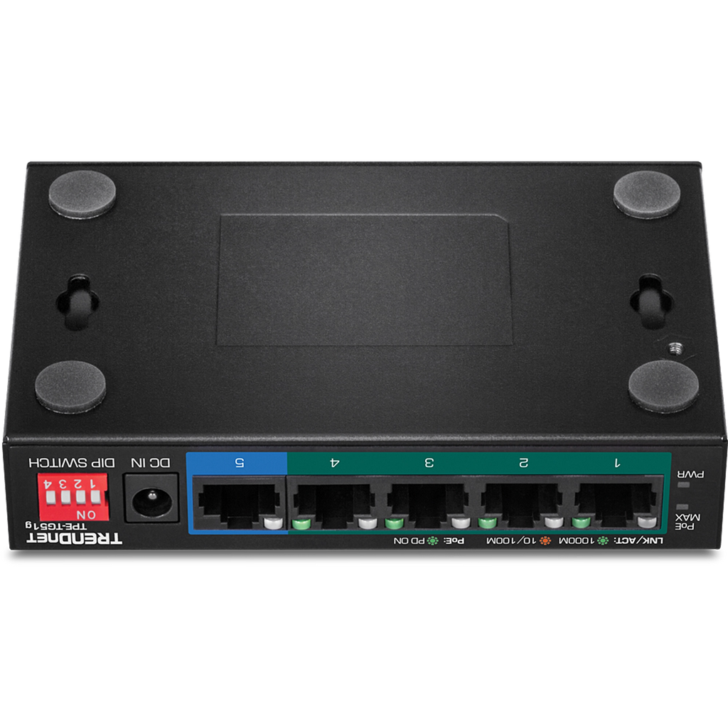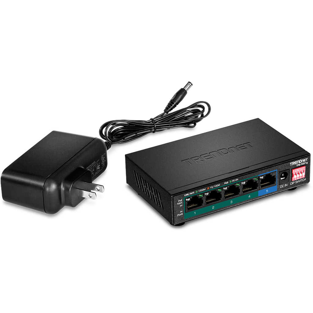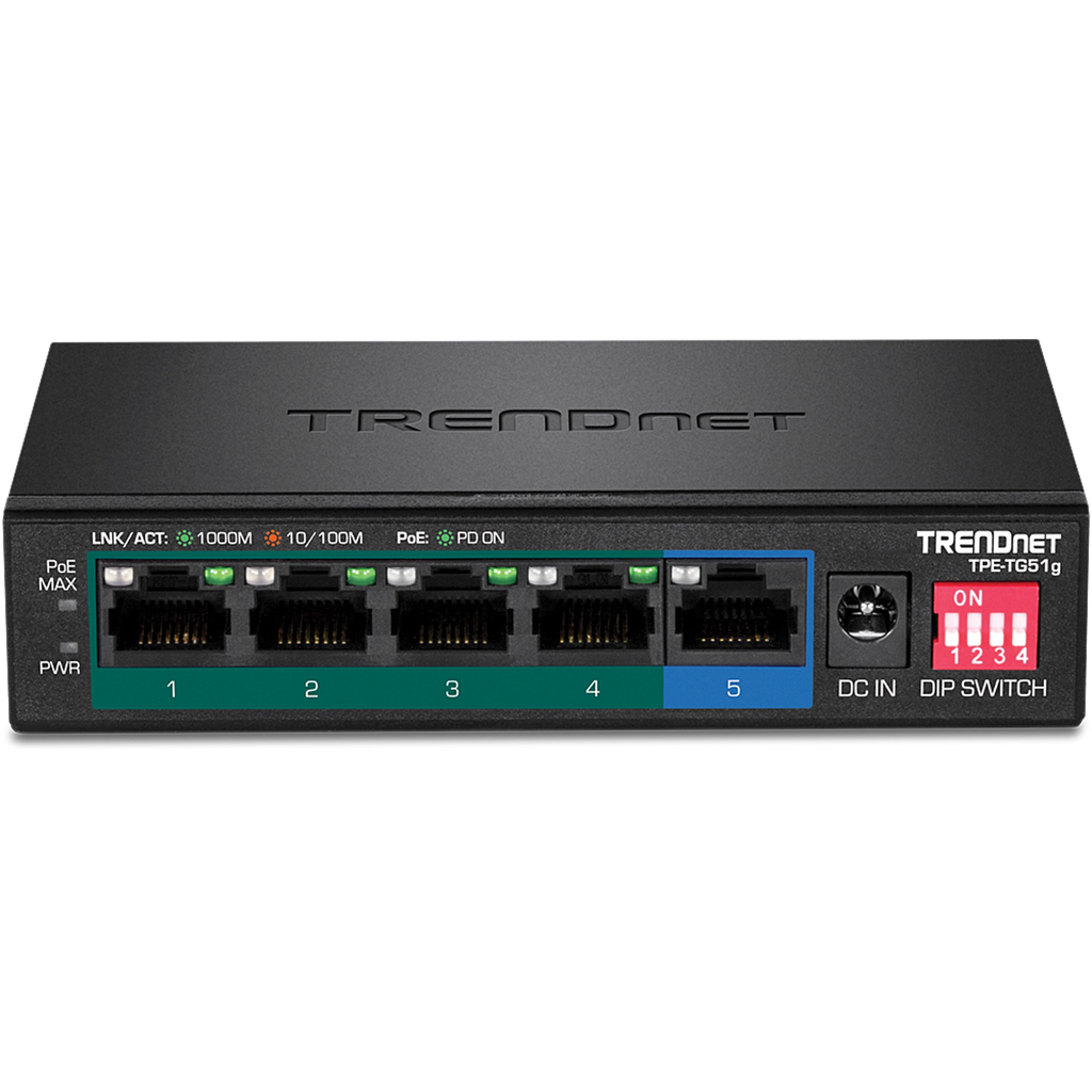 TRENDnet’s 5-Port Gigabit PoE+ Switch, model TPE-TG51g, delivers data and power over existing Ethernet cables to Power over Ethernet (PoE) devices, such as access points and IP cameras. This long-range PoE switch supports both PoE and PoE+ devices with a 60W PoE power budget. Enable the DIP switch to extend the PoE+ signal up to 200m (656 ft.) at 10Mbps for long distance PoE installations. Easily install this long-range PoE switch for reliable high-speed PoE networking.