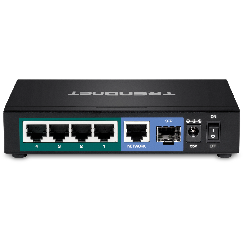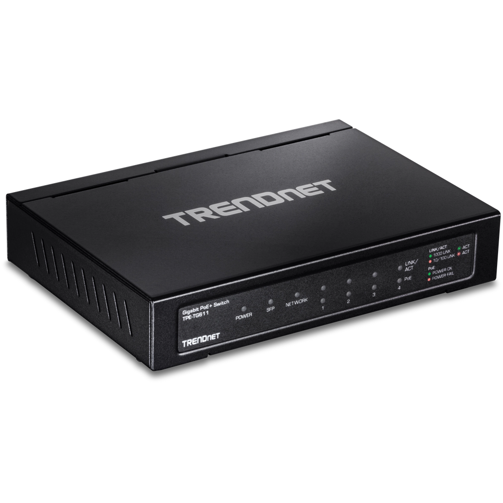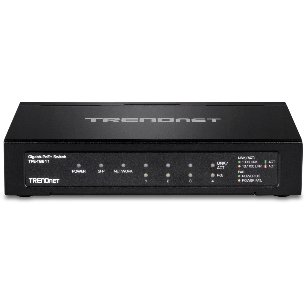 TRENDnet's 6-Port Gigabit PoE+ Switch, model TPE-TG611, reduces equipment and installation costs by delivering data and power over existing Ethernet cables. This small network switch with SFP support provides four gigabit PoE+ ports with a total PoE power budget of 65W, one gigabit port, and one SFP slot for fiber applications. With PoE technology, users only need one set of cables to deliver both data and power. The small network switch with SFP support allows you to network PoE devices such as wireless access points, IP cameras, VoIP phones, IP video encoders, access controls, and more. The added SFP slot supports both single mode and multi-mode fiber SFP modules for long-distance fiber networking applications.