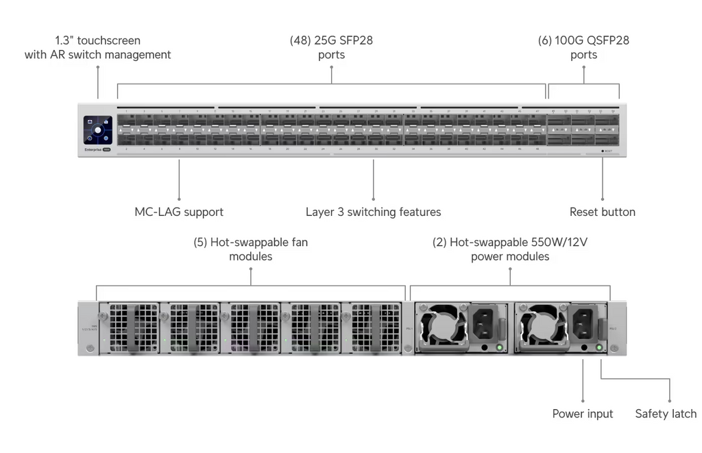 1.8 Tbps high-density 100G/25G Layer 3 Etherlighting aggregation switch with MC-LAG support for high availability system design.